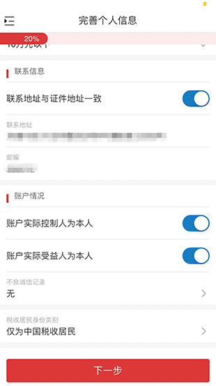 4、請認(rèn)真核對系統(tǒng)識別的信息是否正確,如有錯(cuò)誤請手動進(jìn)行修改;在頁面下方選擇【行業(yè)】、【職業(yè)】、【學(xué)歷】等選項(xiàng),然后點(diǎn)擊【下一步】。