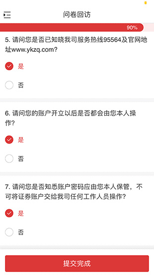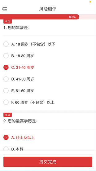 10、進(jìn)入【風(fēng)險(xiǎn)測評】頁面,進(jìn)行相應(yīng)的填寫之后,如無問題則點(diǎn)擊【提交完成】。